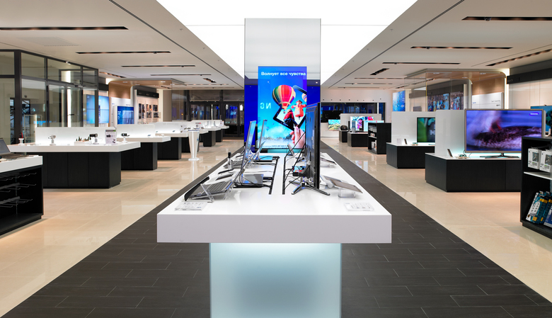 Für den Premium Brand Store zur Präsentation von Highend-Technologie auf über 600 qm Verkaufsfläche in Moskau hat Samsung auf hartmannvonsiebenthals Entwurfs-, Planungs- und Projektmanagement-Kompetenz gesetzt. Die Designgrundlage lieferte das koreanische Unternehmen Cheil – bei hartmannvonsiebenthal wurde sie ausformuliert und realisiert.