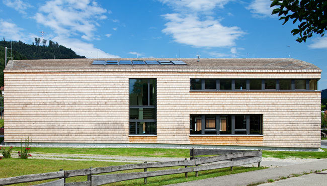 Weite Teile des Gebäudes sind als veredelter Rohbau realisiert, ohne zusätzliche Sichtoberflächen. Holz als moderner Baustoff kommt dabei in seiner ganzen Vielfalt zum Einsatz. Auch die Technik steht für eine nachhaltige Forstwirtschaft: der Bau wird über eine moderne Pelletsanlage beheizt, das Brauchwasser über Dachkollektoren erwärmt. Die innere Struktur ist einfach gehalten, ebenso die Detaillierung und die Materialien, um den engen Kostenrahmen einzuhalten.