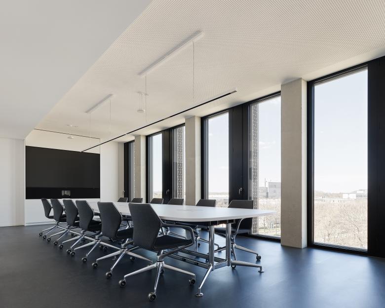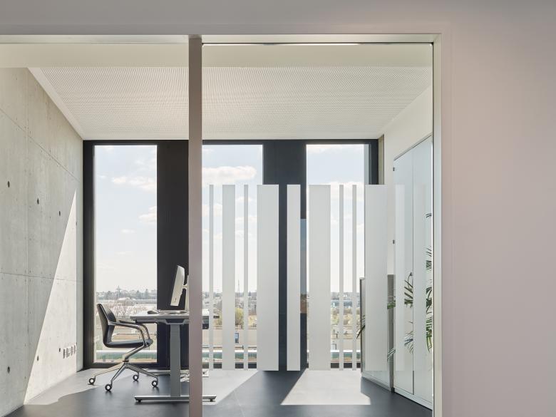 Die unterschiedlich großen, frei möblierbaren Arbeitsräume für Verwaltung, vertrauliche Beratung oder interne Besprechung haben alle einen gleichwertigen Außenbezug. Verglaste Wandelemente zu den Fluren hin sorgen für Licht und ein Gefühl der Durchlässigkeit. Die reduzierte Innengestaltung mit zumeist weißen Oberflächen, die im Kontrast zur brettgeschalten Sichtbetonoberfläche des aussteifenden Beton-Kerns steht, sorgt für durchgängige Ruhe und eine neutrale, dennoch freundliche Beratungsatmosphäre, die Schwellenängste nicht aufkommen lässt.