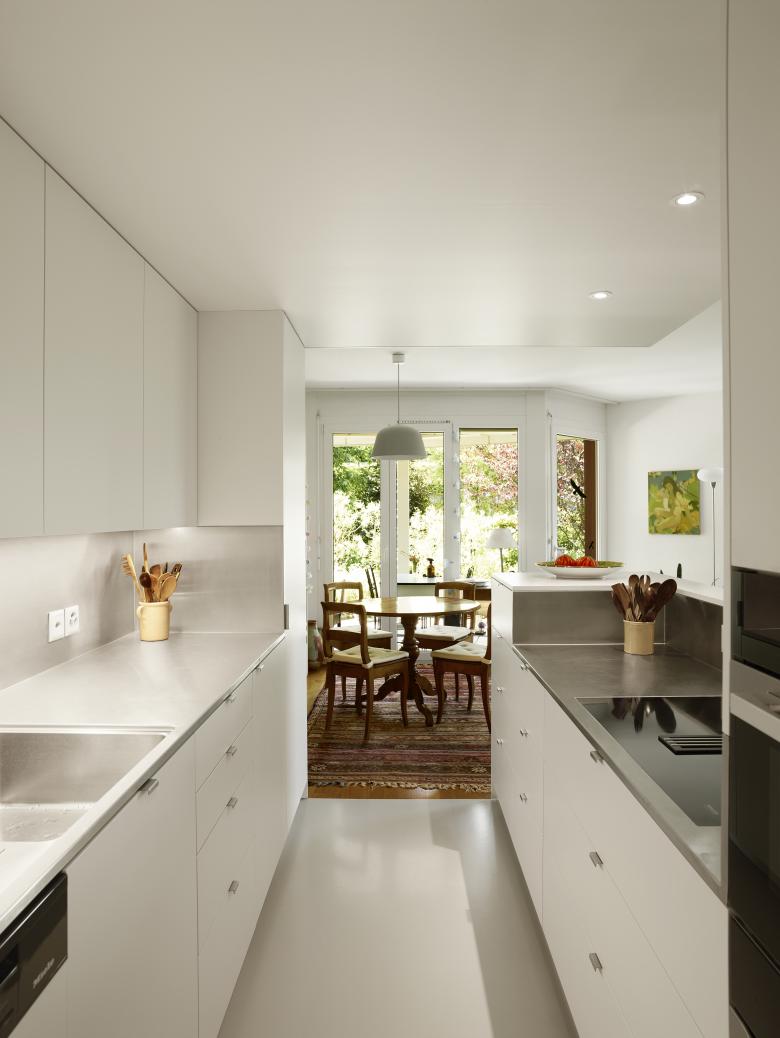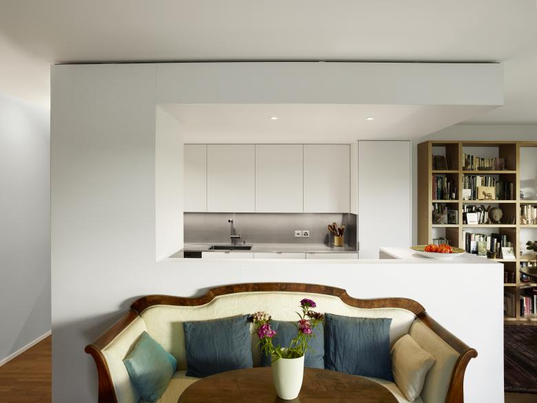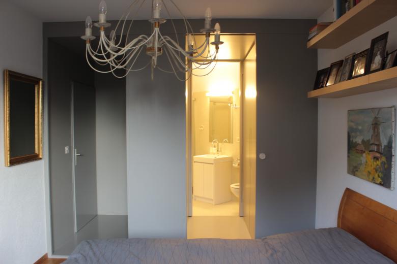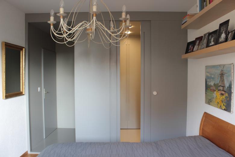 Deux inserts en menuiserie reliés par un papier peint dessiné sur mesure résolvent avec leur forme très simple la complexité spatiale toute d’angles coupés à 45 degrés de l’architecture d’origine d’une PPE des années ’80. Très précisément positionnés, ils sont tour à tour hall d’entrée, cuisine puis se muent, dans la chambre à couché, en petit hall-dressing et forme un trait d’union entre la salle d’eau et la chambre. Bien que sans prétention, ils amènent une respiration bienvenue et donnent une certaine représentativité aux espaces remodelés.
