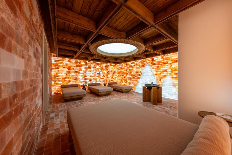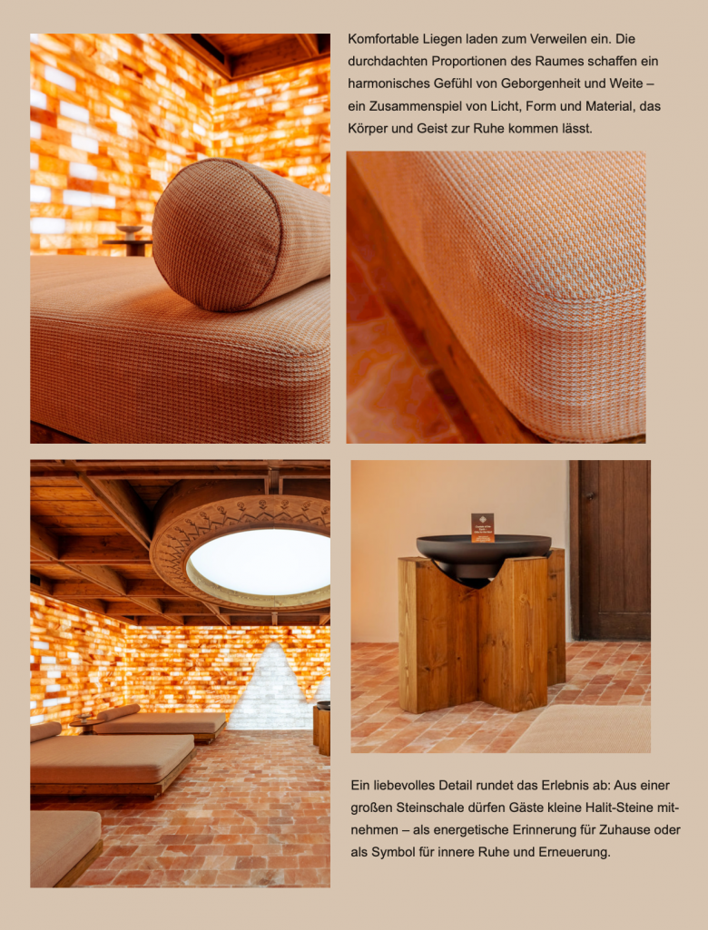 Im Einklang mit dieser Philosophie ist ein ganz besonderer Rückzugsort entstanden: der neue Salzraum im Spa-Bereich des Hauses.Im Zentrum des gestalterischen Konzepts steht die kraftvolle Wirkung natürlicher Materialien. Beson- ders eindrucksvoll: die hinterleuchteten Salzstein- wände, die ein sanftes, mineralisches Leuchten verströmen und dem Raum eine wohltuende Tiefe verleihen. Die Decke aus Altholz bringt alpine Ur- sprünglichkeit ins Spiel, während ein rundes „Tunable White“-Lichtfeld den natürlichen Verlauf des Tageslichts nachbildet – eine subtile Unterstüt- zung für innere Ausgeglichenheit.