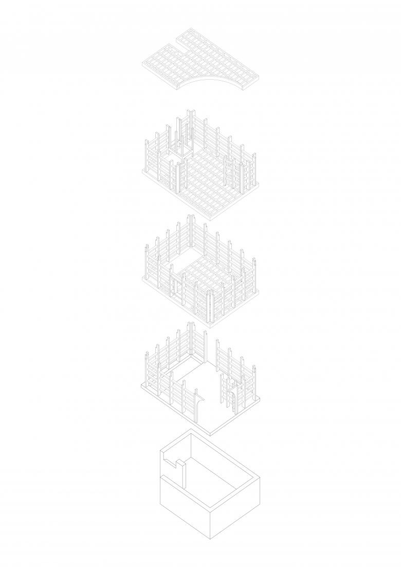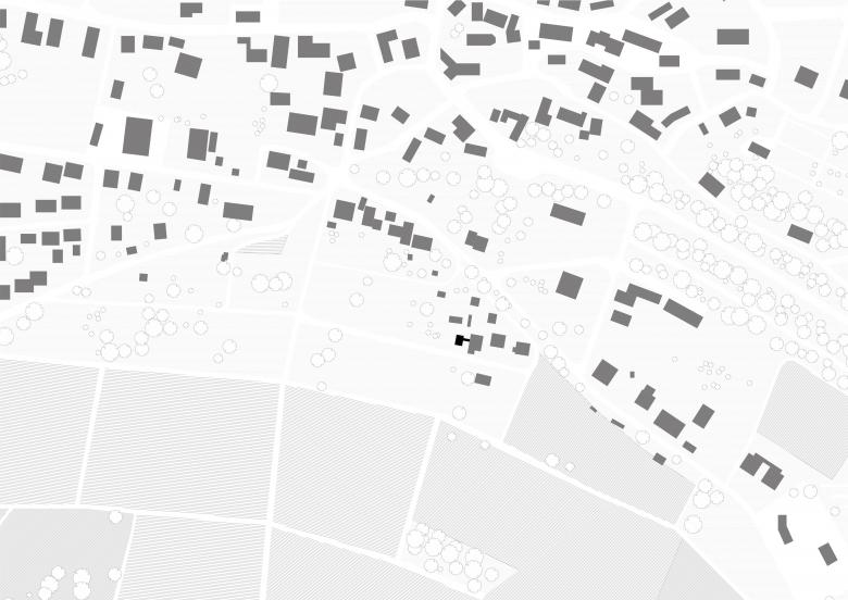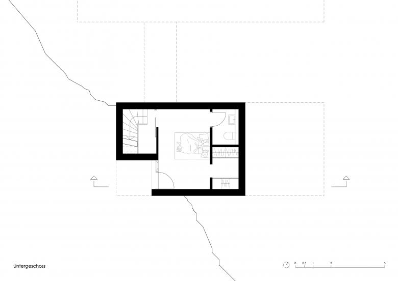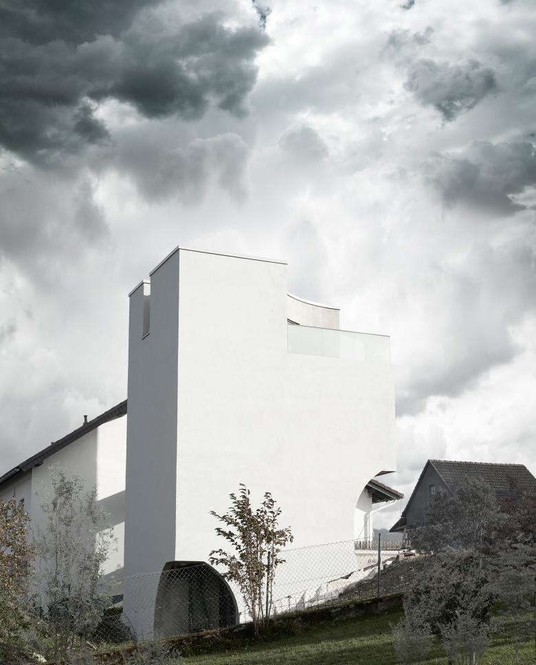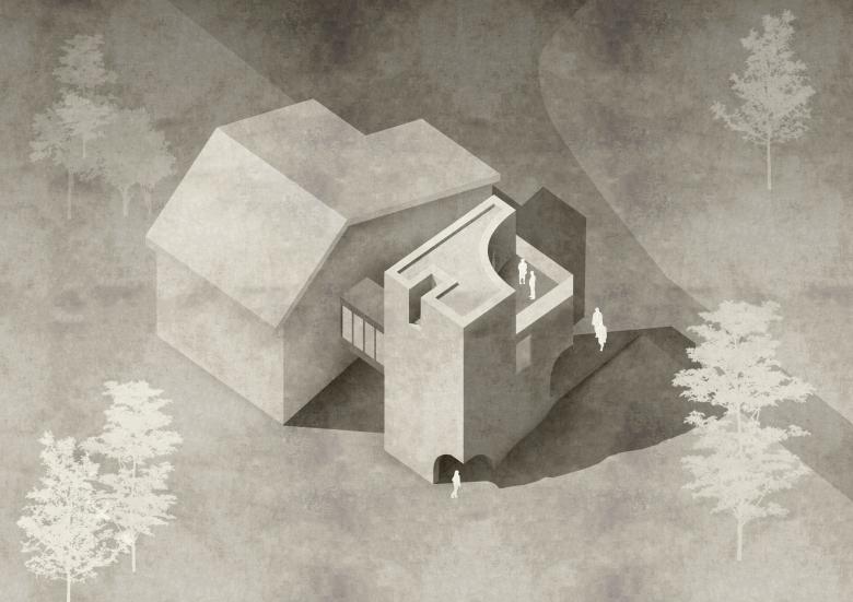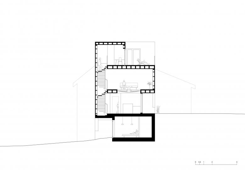 Um dem Landverbrauch zu minimieren, wurde auf kleinster Fläche (ca. 20 qm) der Anbau realisiert, indem vier Räume aufeinandergestapelt wurden, die abwechselnd introvertiert und extrovertiert sind. Im Untergeschoss befindet sich das Schlafzimmer, im Erdgeschoss die Küche mit Essbereich, im Zwischengeschoss das Lesezimmer und im Dachgeschoss das Bad mit Dachterrasse, die einen spektakulären Blick auf die Umgebung freigibt.