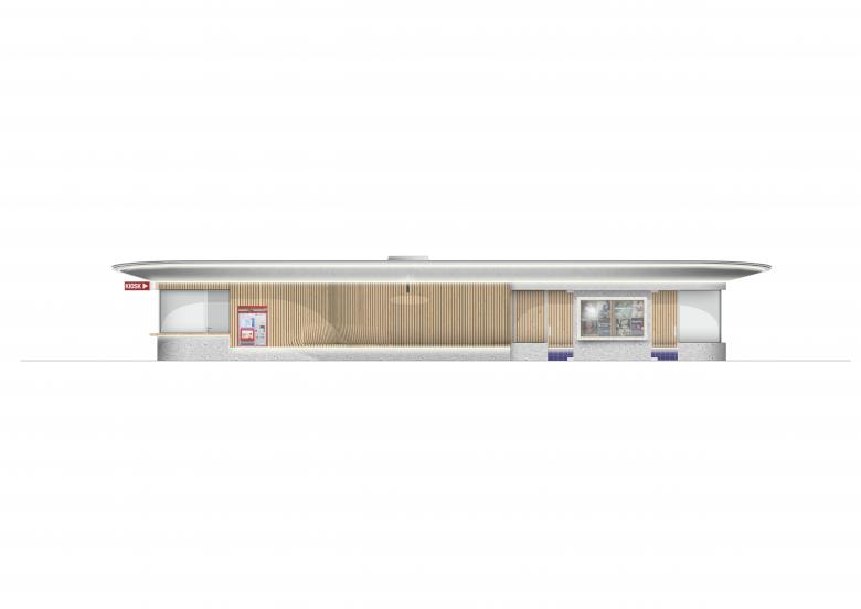 Die Materialisierung folgt einem klaren Zusammenspiel von rohem Sichtbeton und warmen, taktilen Oberflächen aus Holz. Während die bestehende Betonarchitektur gut ablesbar bleibt, ergänzen neue Einbauten aus Holz und Glas die Struktur präzise. Der Kiosk öffnet sich zur Platzseite und erhält eine transparente Glasfassade, welche Innen- und Aussenraum visuell verbindet und den öffentlichen Charakter der Haltestelle stärkt. Ein umlaufender Holztresen bildet das funktionale Zentrum und strukturiert zugleich den Übergang zwischen Perron, Wartebereich und öffentlichem Raum.