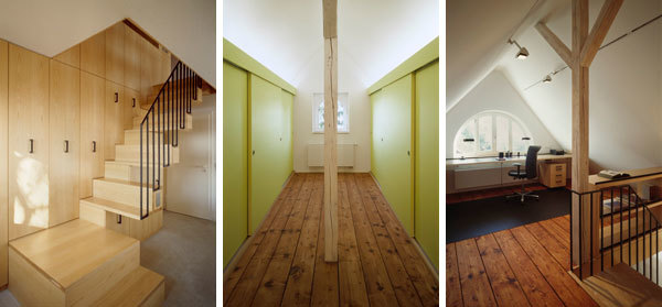 Mit Eschenholz wird ein kragendes Treppenmöbel gestaltet. Das Dachgeschoß wird als Studio dem Schlafzimmer als Luftraum beigordnet. Ein klassisches Rundbogenfenster rahmt den Blick in die Landschaft. Stauräume werden mit leichten Keilrahmenleinwänden als Schiebtüren verborgen. Der Arbeitsplatz wird mit Regalen, Boxen und Arbeitsplatte ebenfalls in Esche eingebaut. Der Raum wird mit Licht und Farbe inszeniert.