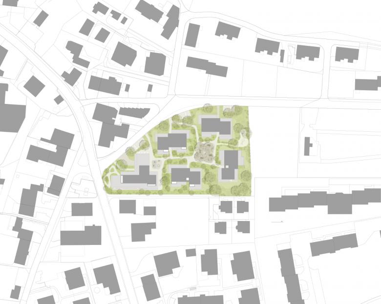Aufgrund der unterschiedlichen Bauzonen und Vorschriften haben wir uns für eine Gesamtbebauung entschieden, welche sich in seiner Höhe staffelt und zur Ostseite mit zwei höheren Häusern einen Abschluss setzt. Die unterschiedlichen Nutzungen und Positionierungen von Pflege- über Miet- bis zu Eigentumswohnungen wurden exakt beurteilt und auf die Qualität und Positionierung ausgewertet.