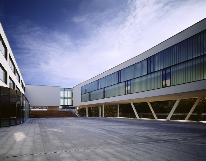 Die Konzeption als “Vierkanter” gibt dem Baukörper eine starke Identität und zugleich einen Bezug zur Region. Entsprechend dem starken Gefälle des Bauplatzes ist die vertikale Gliederung des Gebäudes ein wesentliches Merkmal des Entwurfes. Klassenzimmer und Büros sind zweigeschoßig in dem angehobenen Baukörper oberhalb des Campus untergebracht.