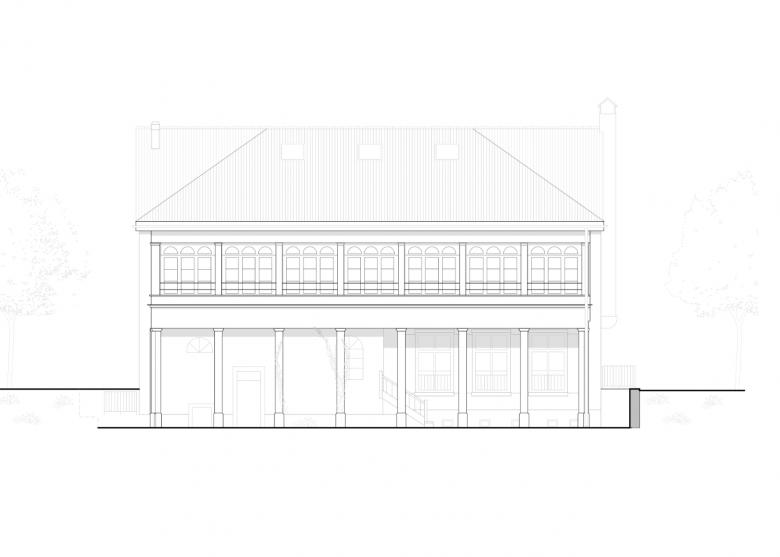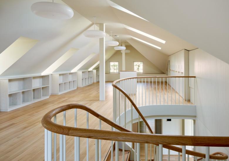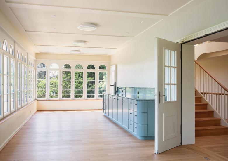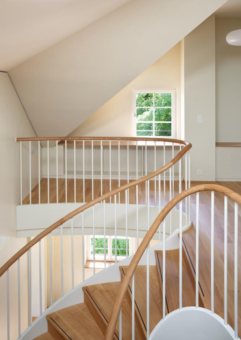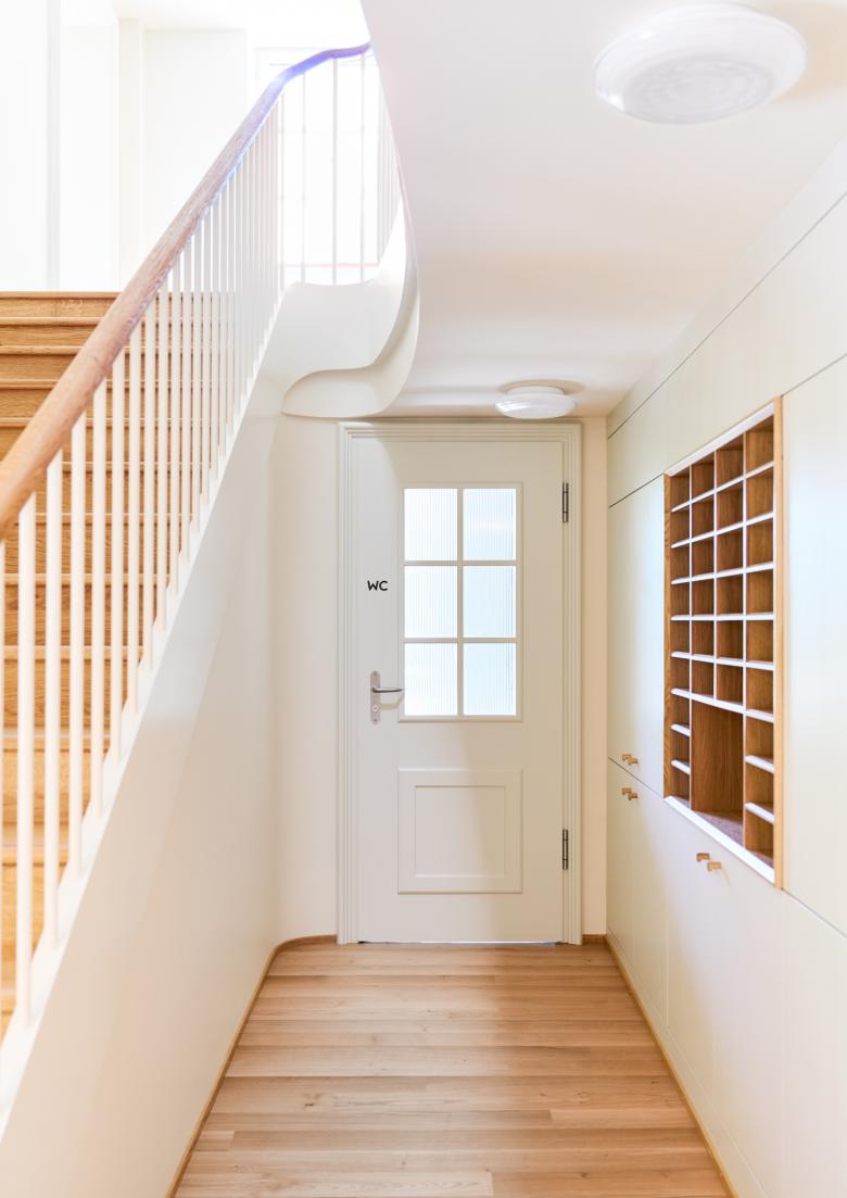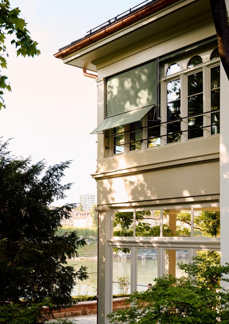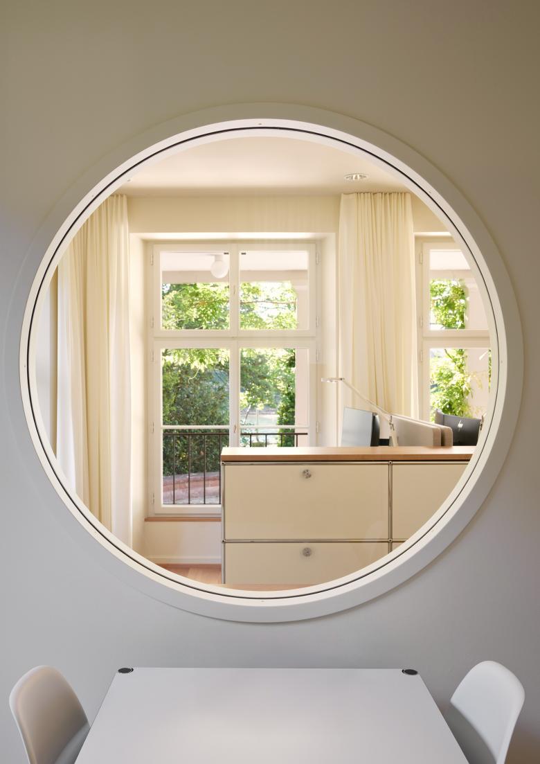 Ziel war es, funktionale und flexible Arbeitsräume zu schaffen und zugleich die architektonische Identität zu bewahren. Die neue Treppenanlage und die überarbeiteten Innentüren zeigen exemplarisch das Zusammenspiel historischer Elemente mit heutigen Anforderungen. Der ausgebaute Dachstock mit Lukarnen und Giebelfenstern bietet helle Arbeitsplätze und eine effiziente Archivablage, eine neue zentrale Treppe verbindet alle Geschosse und in der verglasten Veranda entstand ein Besprechungsbereich mit Blick auf den Rhein.