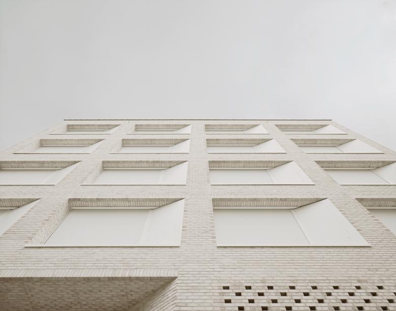 Zur Gestaltung eines flächigen, monochromen Fassadenlooks in Weiß, wurden senkrecht geführte, außenliegende Fassadenmarkisen nahezu flächenbündig mit den Fensterelementen in der Leibung integriert und farblich auf die Fassade und Fensterelemente abgestimmt. Hierzu wurde das Sonnenschutzmaterial Soltis Perform in der Referenz 92-2044 Weiß ausgewählt, um die Homogenität des Fassadenkonzepts zu unterstützen. Durch die Précontraint Technologie des Sonnenschutzgewebes von Serge Ferrari, bei der das Material während der Beschichtung von allen Seiten vorgespannt wird, erhält dieses eine besondere Dimensionsstabilität und Planheit. So wurden auch die von den Architekten geplanten großformatigen Screens bis zu einem Format von 4,70 und 2,70 m darstellbar und dies ohne Verstärkungen oder teilende Nähte, um den puristischen Look zu untermalen. Ein weiterer Vorteil war die faltenfreie Aufwicklung, Robustheit und Reinigungsfreundlichkeit des Gewebes, sodass auch bei dieser sehr hellen Farbe für den Sonnenschutz eine hochwertige Optik gewährleistet wird.