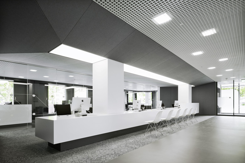 Nutzung des Neubaus als Bürogebäude mit flexibel nutzbarem Foyer/Kundenzentrum (EG), stützenfreien Flächen für Einzel- oder Großraumbüros, Kundenzentrum, Lager und Technik sowie Besprechungs- und Schulungsräumen. Verkleidung der Fassade mit Ziegelmauerwerk. Bestandsanbindung des Neubaus über eingeschossigen Verbindungsgang (Stahl-Glas).