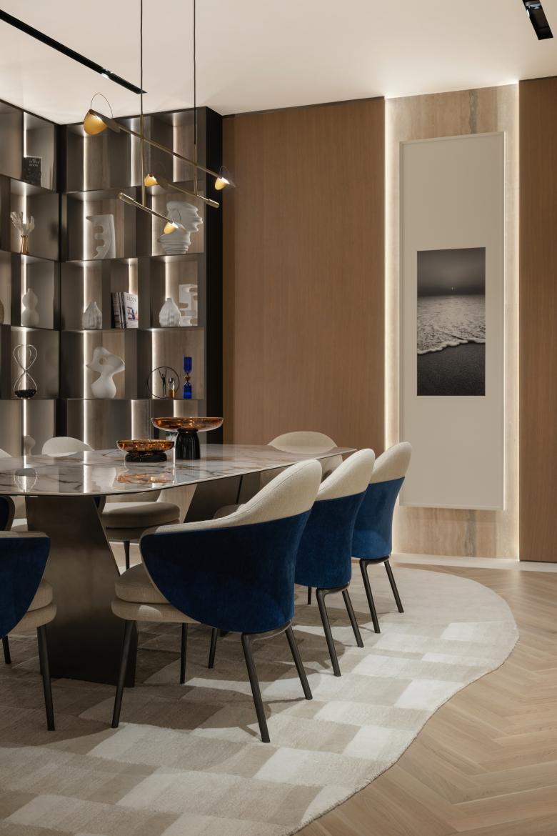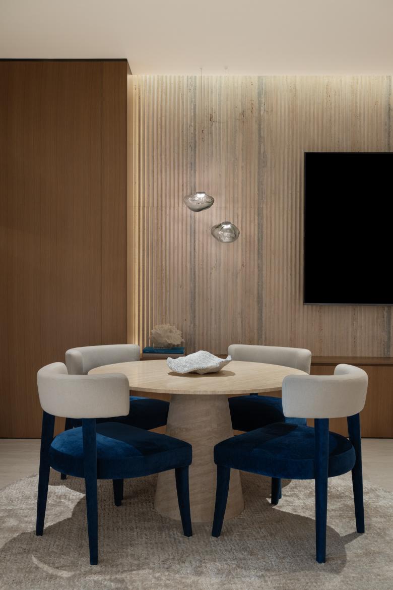 Spatial planning responds to both context and constraint. A narrow floor plate presented a key challenge, particularly as the brief required each apartment to occupy a full floor in order to secure panoramic sea views for every residence. Through careful organisation and open-plan layouts, the design maximises visual continuity and openness while maintaining privacy and clarity of circulation. Material selection plays a defining role in the project’s identity. Ribbed travertine walls introduce texture and depth, referencing Italian craftsmanship, while bronze glass wardrobe doors add a refined, reflective quality to the interiors. Neutral yet tactile finishes are used throughout to establish a calm atmosphere that complements the coastal setting. Open-plan kitchens are integrated seamlessly into the living spaces, supporting both functionality and spatial flow.
