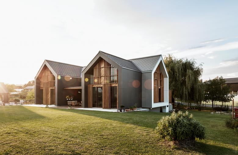 Das Haus, verkleidet mit Swisspearl Fassadentafeln Nobilis, besteht aus drei Volumen mit Satteldächern und ist gabelförmig angeordnet. Lotrecht zum Hauptkörper stehen zwei Gebäudeteile parallel zueinander und bilden einen geschützten Außenraum, der vielfältig genutzt werden kann. Im Wesentlichen haben die Architekten eine moderne Interpretation einer herkömmlichen Scheune kreiert.