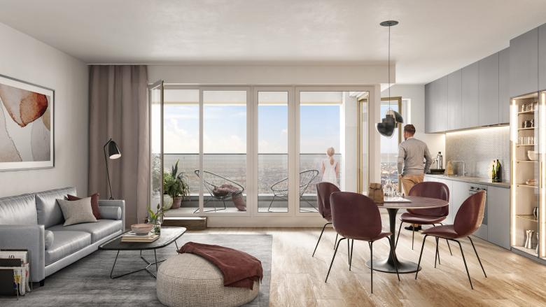 Das Bebauungskonzept sieht einen rechteckigen, 13-geschossigen Baukörper (Hochpunkt „E") auf einem zweigeschossigen Sockelbau mit einer Wohnfläche von ca. 10.000 qm vor. Während im Hochpunkt auf den Etagen Geschosswohnungsbau realisiert wird, befinden sich im Sockel zweigeschossige Maisonettewohnungen sowie der Eingangsbereich des Hochhauses. Nahezu das gesamte Grundstück wird mit einer zweigeschossigen Tiefgarage unterbaut, die neben den Stellplätzen auch die Mieterkeller aufnimmt. Die Baumaßnahme soll im Effizienzhausstandard gemäß KfW55 umgesetzt werden.