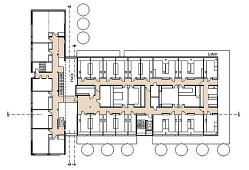 Typologisch gliedert sich das Gebäude analog der Hauptnutzungen: der zweigeschossige, gläserne Labortrakt "schwebt" über der Bibliothek. Abgelöst durch die verglaste Eingangshalle bildet der verklinkerte Seminar - und Verwaltungsriegel eine viergeschossige Dominante.