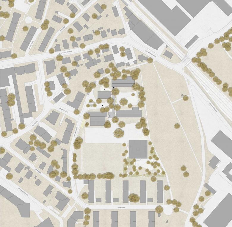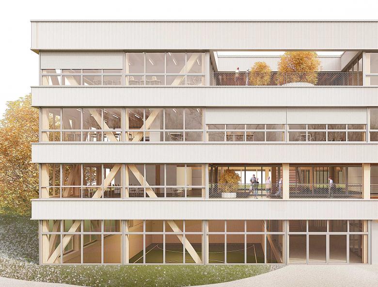 Das neue Schulhaus tritt als eigenständiger und selbstbewusster Baukörper in Erscheinung ohne in Konkurrenz zu der bestehenden denkmalgeschützten Schulanlage zu stehen. Das äussere Erscheinungsbild der Schule ist geprägt von der horizontalen Gliederung. Die Fassadenbänder zeichnen die Umrisse des Volumens nach und gliedern den Baukörper in der Vertikalen. Die Geschosse werden dadurch klar lesbar und es wird eine für die Kinder angepasste Massstäblichkeit erreicht. Die Fassadenbänder bestehen aus Lichtwellplatten (Scobalit) und werden beidseitig durch ein Aluminiumprofil gefasst. Die Holzmetallfenster sind aus natureloxiertem Aluminium. Die eher kühlen industriellen Materialien der Fassadenhaut stehen im spannungsvollen Kontrast zur hölzernen sichtbaren Tragstruktur im Inneren. Die unterschiedlichen Fassaden- und Terrasseneinschnitte modellieren das Volumen und schaffen einen fliessenden Übergang zwischen innen und aussen. Die klare strukturelle Gliederung des Baukörpers und die Materialisierung der Fassadenhaut prägen den Ausdruck des neuen Schulhauses. Es entsteht ein spannungsvoller Baukörper mit individuellem Charakter einer kreativen Lernwerkstatt.