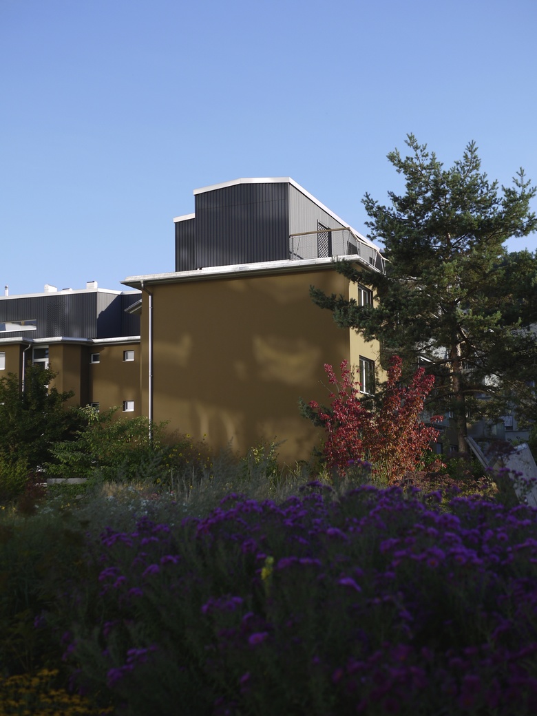 Der neue Dachaufbau wird über das um ein Geschoss erweiterte Treppenhaus im Scheitel des L-förmigen Gebäudekörpers erschlossen. Die Grundrisse wurden von innen heraus so entwickelt, dass aus dem strengen ‚Korsett’ der baurechtlichen Möglichkeiten optimale innen- und aussenräumliche Qualitäten erwachsen konnten.