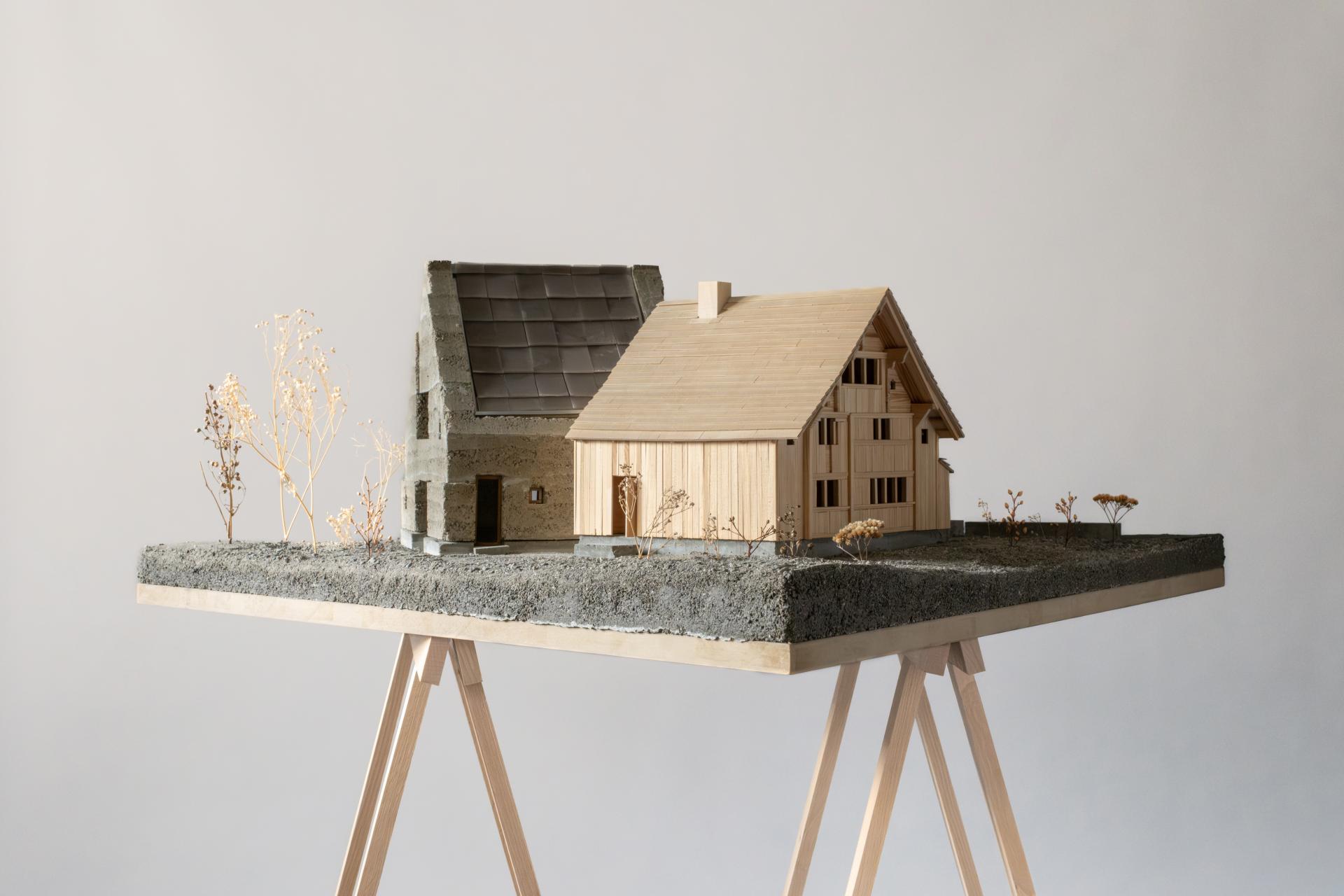 Allen + Crippa versetzten in Grabs im Rheintal ein historisches Blockhaus aus dem 17. Jahrhundert und ergänzten es um einen Stampflehmbau. (Modellfoto: © Allen + Crippa)