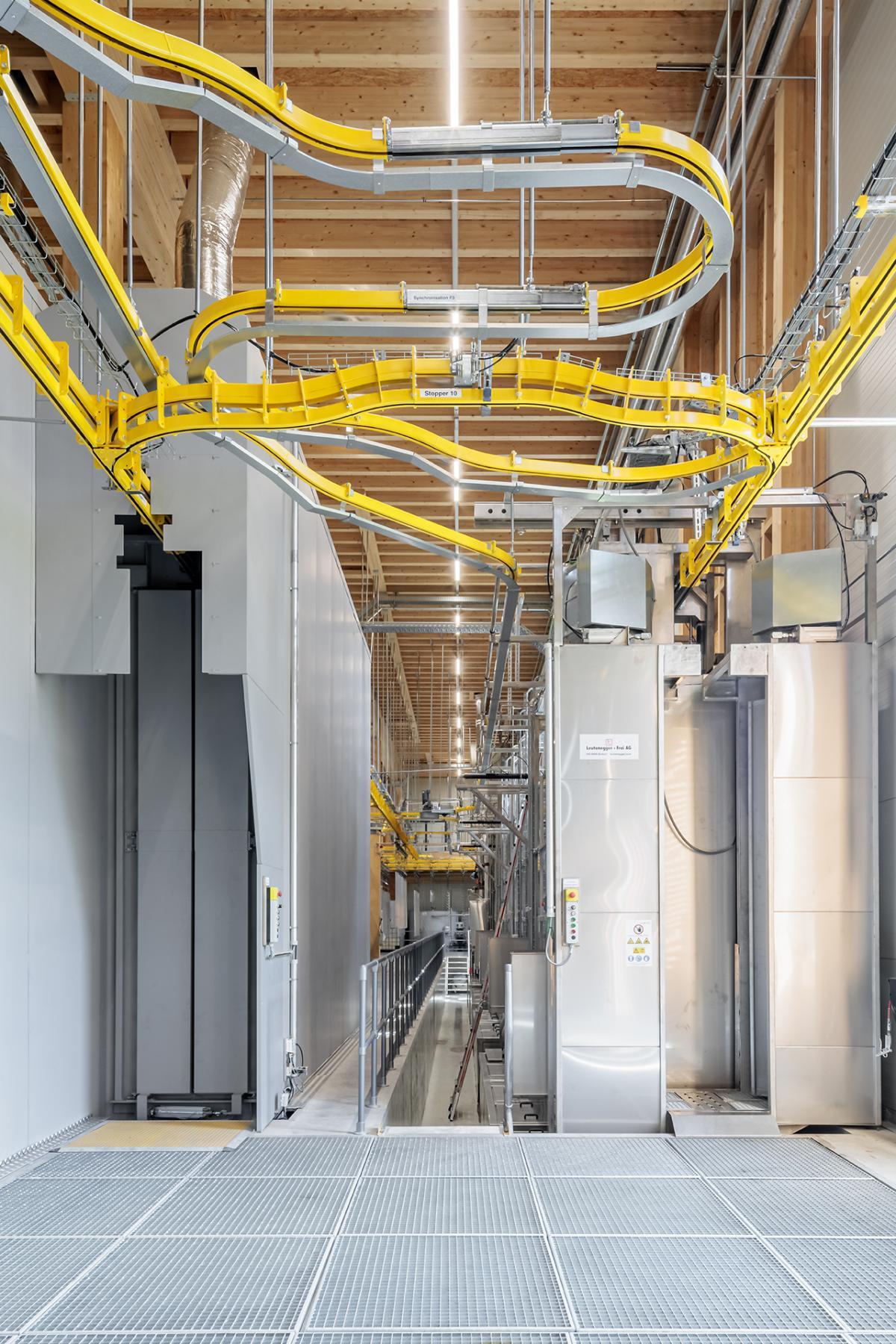En un principio la idea de construir una nave de fabricación toda ella en madera puede resultar sorprendente. Hasta ahora el acero era el material de elección a la hora de llevar a cabo construcciones industriales. De hecho Griesser cuenta con una nave de producción construida en acero justo al lado del edificio de la empresa ahora ampliado. No obstante, la madera ofrece toda una serie de ventajas: en primer lugar, este material de construcción natural acorta los plazos de edificación. Las empresas constructoras de Vorarlberg no necesitaron ni un año para terminar y equipar la nave edificada con madera local. Eso permitió a Griesser poner rápidamente en marcha la producción, lo cual supone un importante punto a favor de este material en el apartado económico. Además, la construcción en madera también ha supuesto una ventaja a la hora de montar la instalación de revestimiento en polvo con la que se refinan las mallorquinas de aluminio: «Para nuestro proveedor suizo esto era una novedad: por primera vez ha integrado una de sus instalaciones en un edificio de madera», explica Martin Barwart, gerente de Griesser Austria. «El sistema de suspensión completo y los equipos se atornillaron directamente en las vigas. El hecho de que las tolerancias sean mayores que en los edificios de acero ha sido de gran ayuda: pudimos efectuar pequeñas adaptaciones sobre la marcha durante el montaje». Y los que temen que en una nave de madera la protección antiincendios se convierta en un problema se equivocan por completo. «Yo formo parte de los servicios de extinción de incendios de mi localidad», explica Martin Barwart. «Sé por experiencia propia que los incendios de los edificios de acero son mucho más peligrosos. Porque las construcciones hechas con acero colapsan de repente y exigen una costosa protección con barnices, mientras que los componentes de construcción de madera maciza soportan las llamas durante largo tiempo».