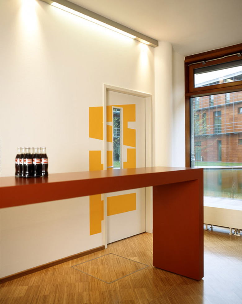 Der eher emotionale als funktionale Ansatz, den die Architektur vorgab, wurde von uns durch ein Farbkonzept mit einer Mischung aus warmen, freundlichen Orange- und Grüngelb-Tönen, haptisch weichen Stoffen und harmonisch aufeinander abgestimmten Materialien im Innenraum fortgeführt.