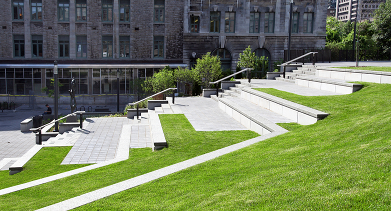 Inside the Milton Gate lies James Square, one of the many green spaces that make up McGill University’s downtown campus. It was imperative that the square’s new design implement the policies of the university's sustainable development plan. These included increasing vegetation cover and improving pedestrian safety. Special consideration was given to improving pedestrian routes and site lighting, as well as reducing the presence of vehicles around the perimeter of the square. Particular attention was paid to providing persons with reduced mobility a space that was as interesting to them as it was to the campus’ able-bodied population. Finally, four works of art from the university’s collection were integrated into the design of the site.