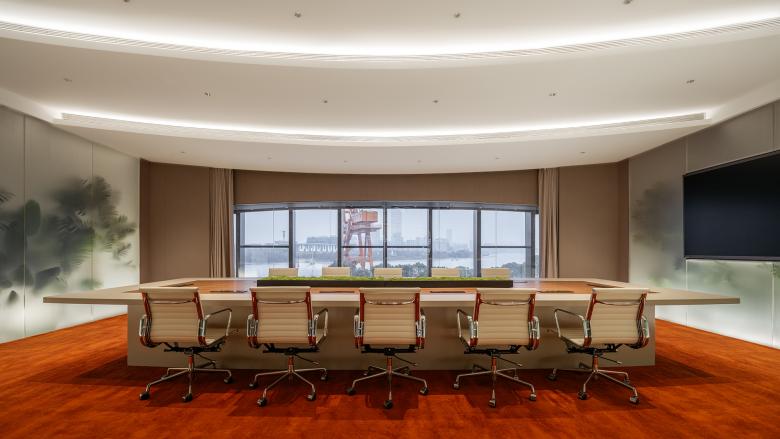 Behind it is a large conference room, surrounded by lush greenery, resembling a forest, facing the slowly eastward-flowing Huangpu River. Reality and imagination converge at this moment, in this space.
