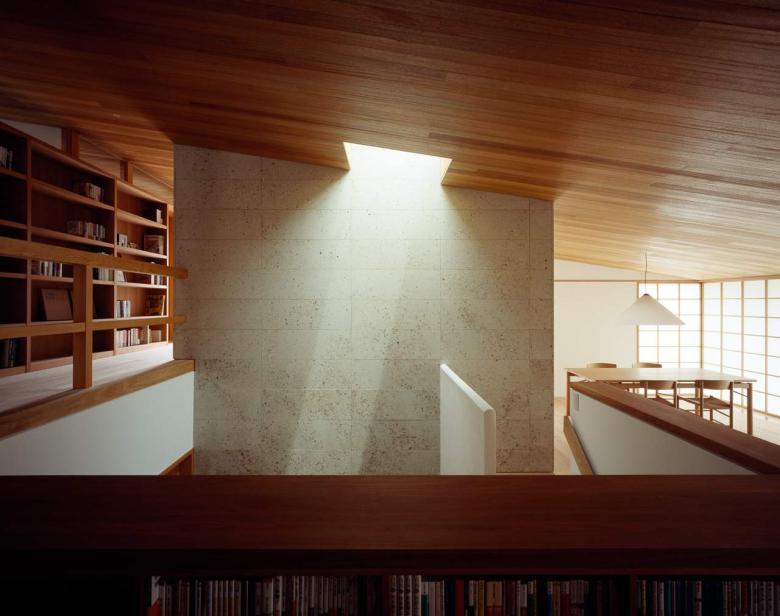 The large opening on the south side of the living/dining room is fitted with sliding shoji doors and wooden blinds, so that the room can be set up in a way that is comfortable for each season. Top lights above the entrance and in the bedrooms allow light to fall on the back of the building. The light is bounced around by the soft Oya stone, the plaster which reflects the light, and the dull shiny lauan wood of the ceiling, enveloping the entire space.