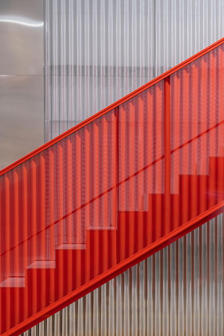 La “piel “ presenta varios tipos de acabados y perforaciones, dando respuesta a las necesidades de privacidad y aislamiento de los distintos espacios que protege, generando un manto materialmente continuo pero con variedad de texturas y brillos. El nuevo núcleo de comunicaciones se convierte en el protagonista de de esta intervención, una banda diagonal de color rojo rompe la linealidad que presenta el despiece vertical de las chapas metálicas, mientras hace un guiño al color corporativo de la empresa y al mundo de la automoción.
