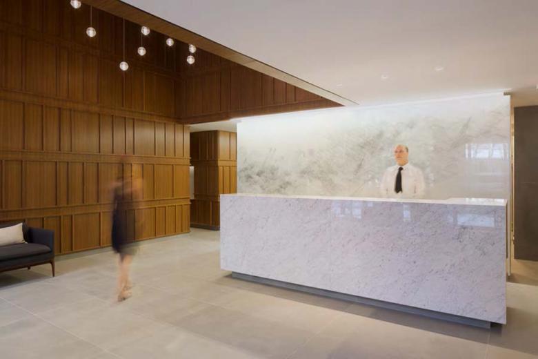 As with the exterior design, the interior is comprised of classical proportions and contemporary character. A well balanced variation of noble materials and details throughout the building creates a sleek style with a touch of luxury vintage, all executed by local craftsmen. Millwork details in the lobby and apartment units accentuate a sophisticated traditional touch, while the muted natural elements and white spaces stage the perfect backdrop for the owners' eclectic styles.