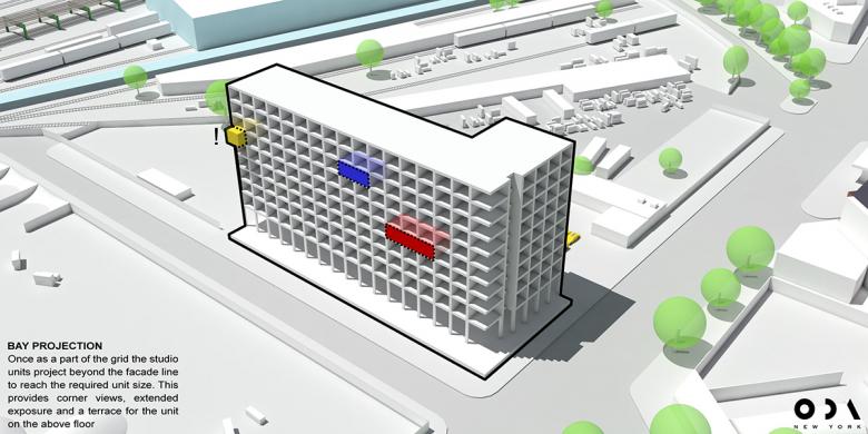 Typifying ODA’s modus operandi, wherein form never precedes function, this strategic modular approach has implications well beyond simple aesthetics. Given the greater length relative to other units, each studio apartment projects seven feet past Jackson’s façade line, producing two significant benefits: mid-facade “corner” windows and a terrace for the apartment above.