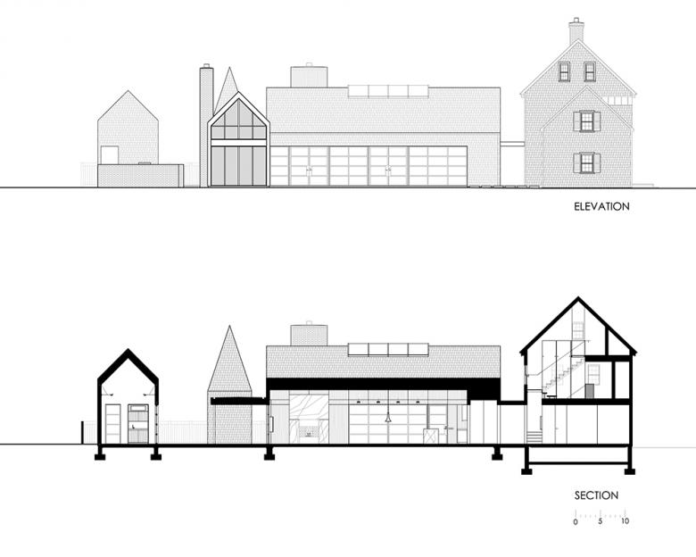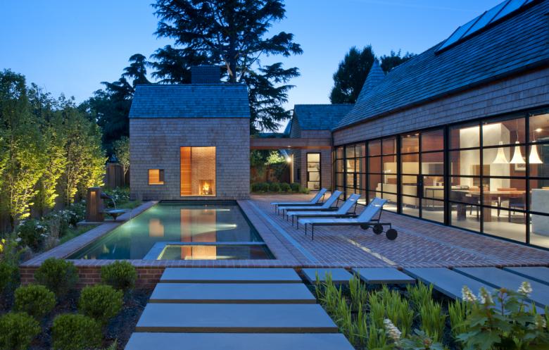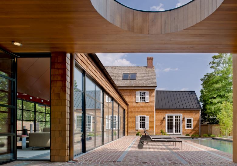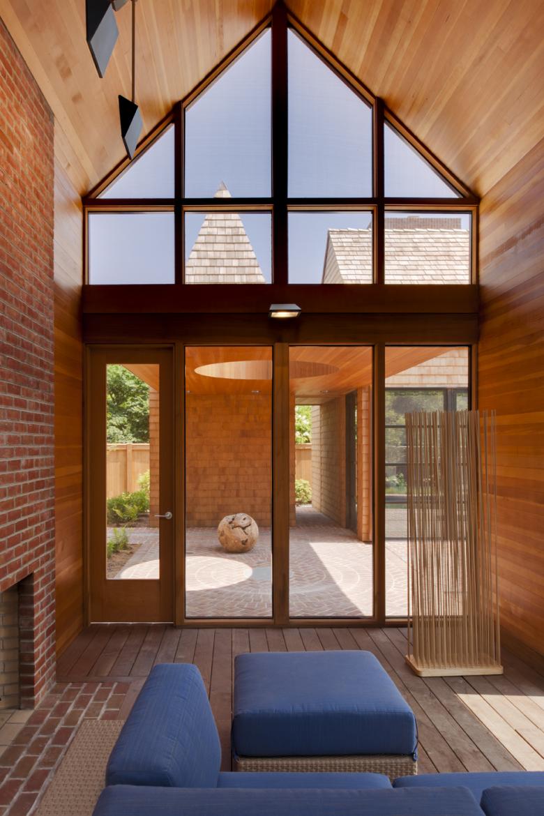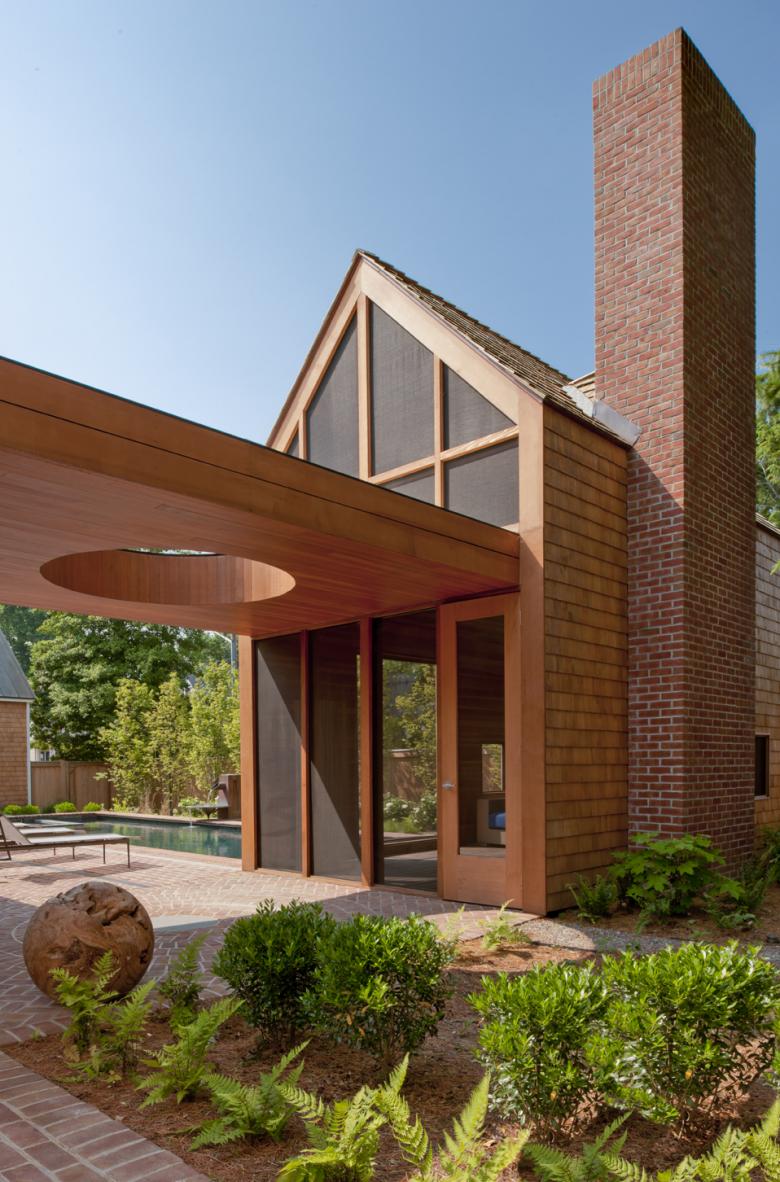 While the exterior of the original house is restored with historically correct detailing, the new pavilions are crisply detailed. Cedar shingled walls and roofs match the historical house but without overhangs and trim. Large expanses of glass set in black steel frames punctuate the cedar walls. Tall red brick chimneys and landscape walls add vertical and horizontal elements, completing the composition.
