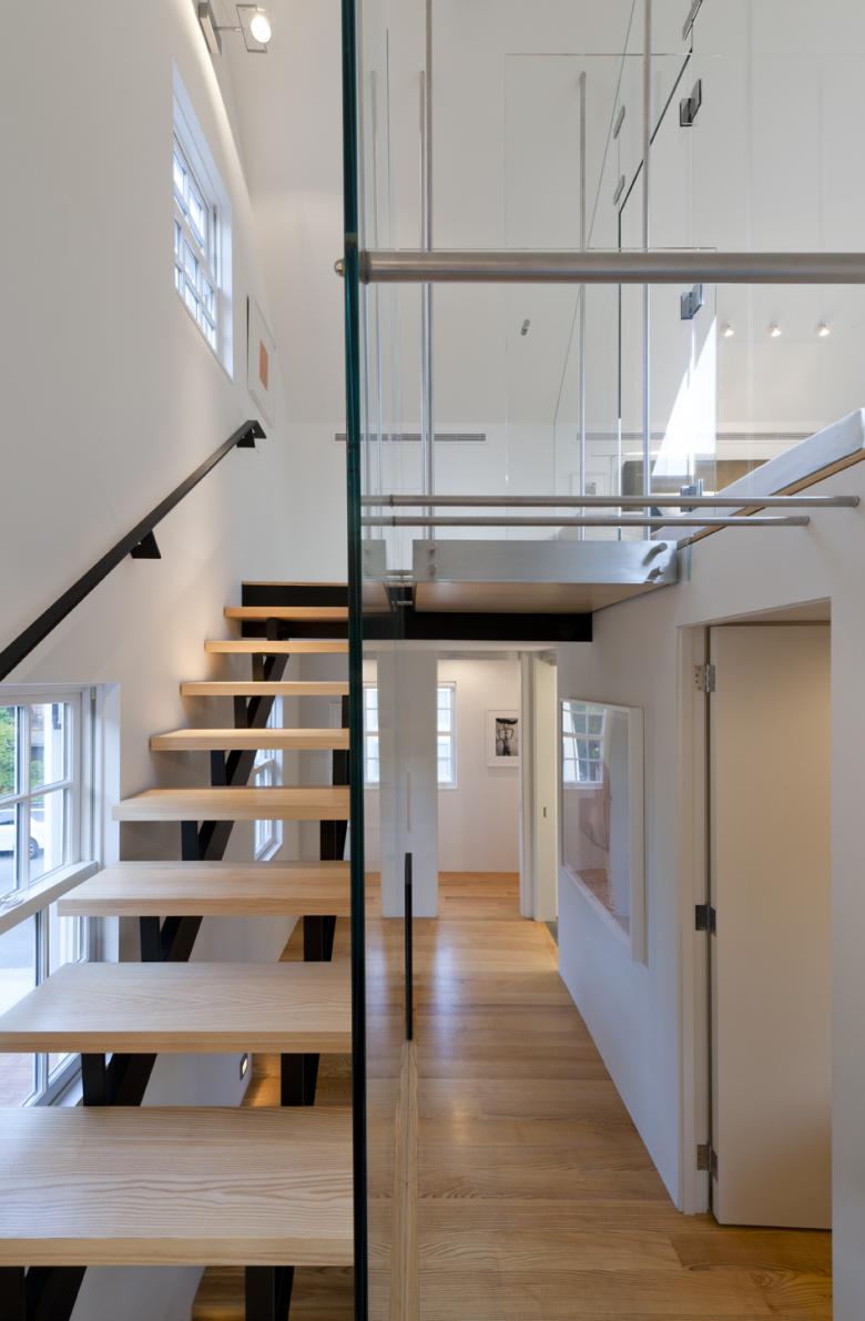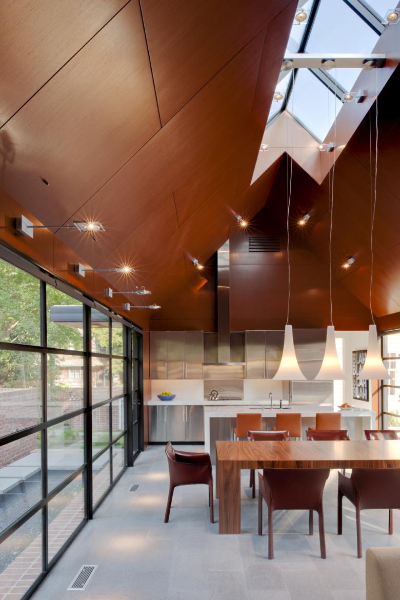 The original house now contains the main entry and four bedrooms. The interiors are decidedly modern with white walls void of trim, casings, moldings and baseboard that engage white ash flooring. An open, floating staircase, glass walls, aluminum and stainless steel contribute to the modern palette of elements and materials. In juxtaposition to the primarily white interiors of the original house, the interior of the new living pavilion is rich with a variety material, including mahogany walls and ceilings, basalt flooring, white marble countertops and fireplace surround and stainless steel cabinetry. Walls of glass and a long skylight at the ridge allow light to flood the pavilion. Additional pavilions contain a bathroom, an exercise room and a screened porch. The screened porch, with Douglas-Fir walls and ceilings, is located at the end of the swimming pool and contains a fireplace allowing the space to be used late into the fall.
