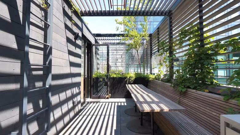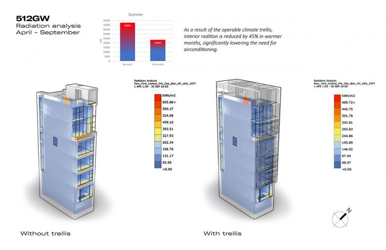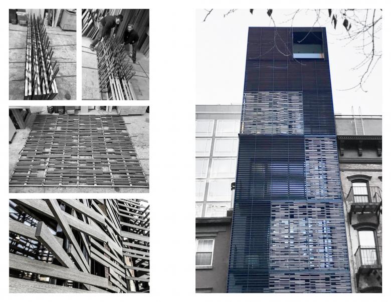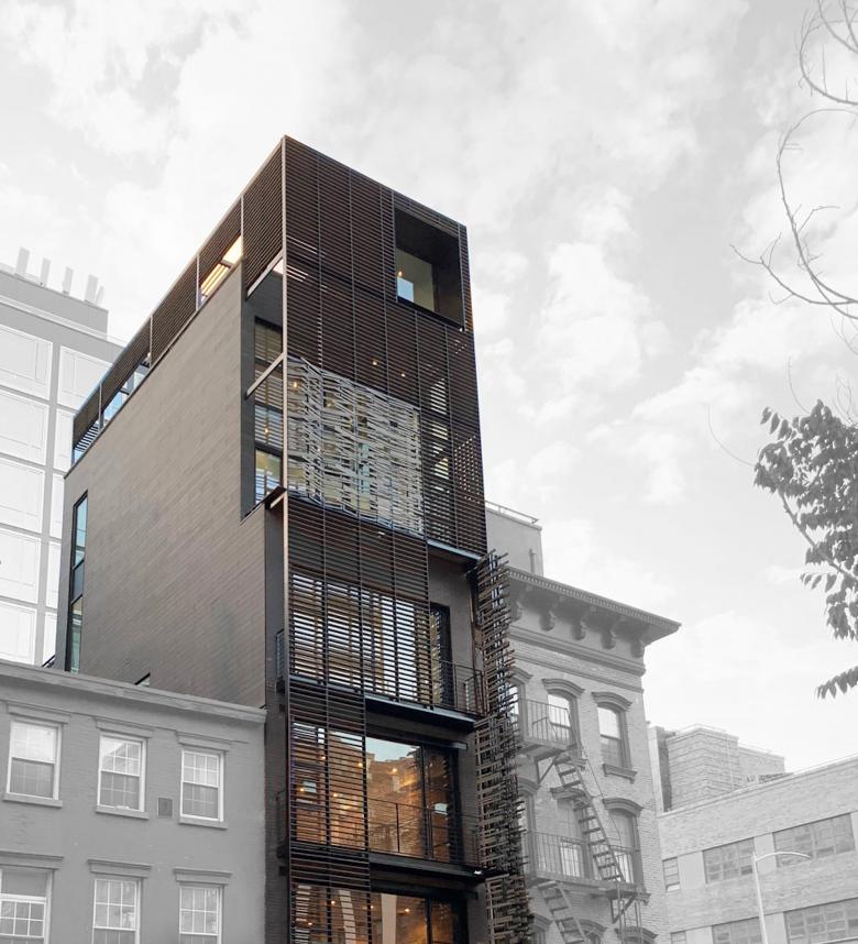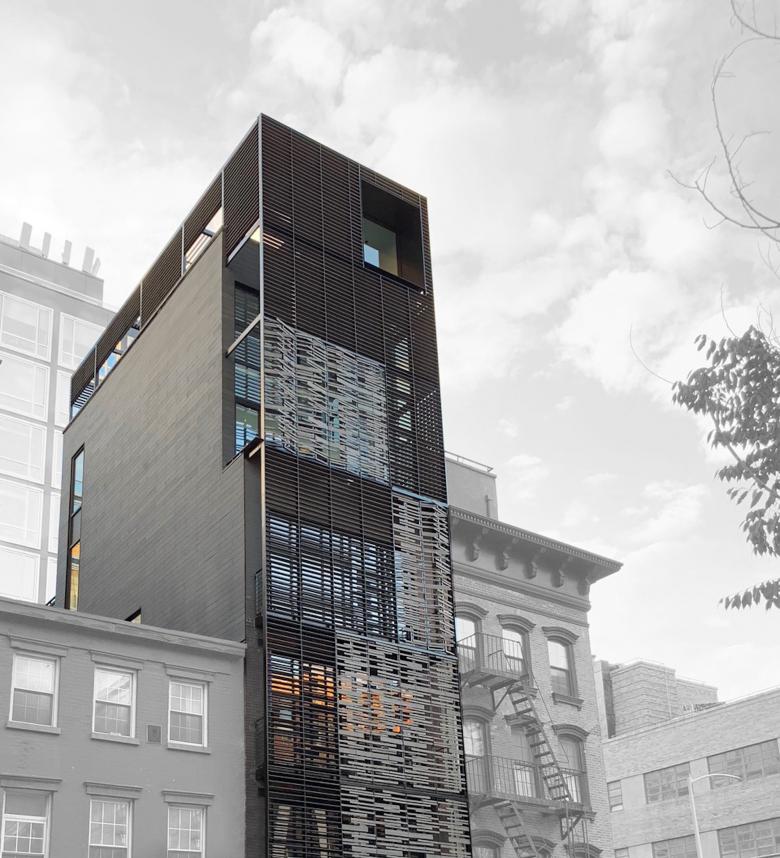 The goal of this renovation of and addition to a residential townhouse in SoHo rethought how a building could actively contribute to a more sustainable urban realm. The building volume setbacks are inscribed within in a unifying, rectangular trellis envelope of multiple patterns and densities. Made from lightweight steel frame and folding panels clad with Trespa slats, this “smart passive climate control envelope” serves as an adaptable perimeter of the building. It provides solar heating in winter and shading and ventilation in summer, while also creating variable levels of privacy for a variety of outdoor balconies and roof terraces.