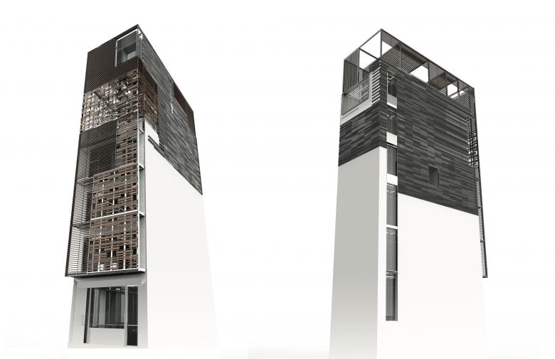 Understanding the current economic and environmental climate, and how it relates to our wellness, we decided to rethink the impact of the residence’s footprint on the environment. By adding a large extension onto an existing building with a footprint of only 19 x 40 feet, we converted this townhouse into an 8-story vertically stacked tower of rooms, wrapped within a spacious lattice envelope functioning as a climatic skin: the third "building."