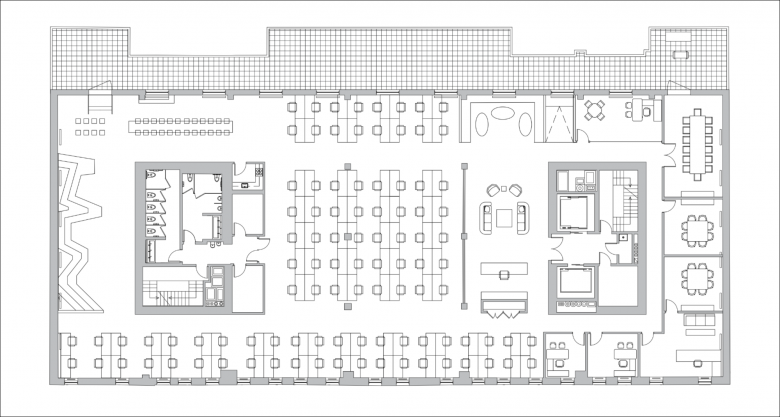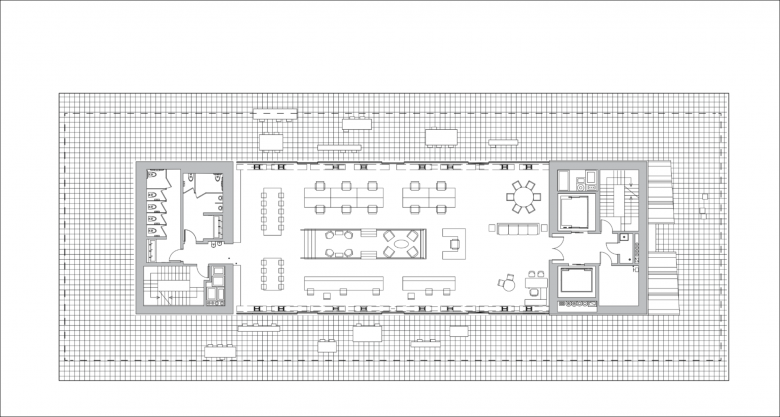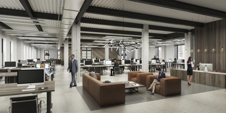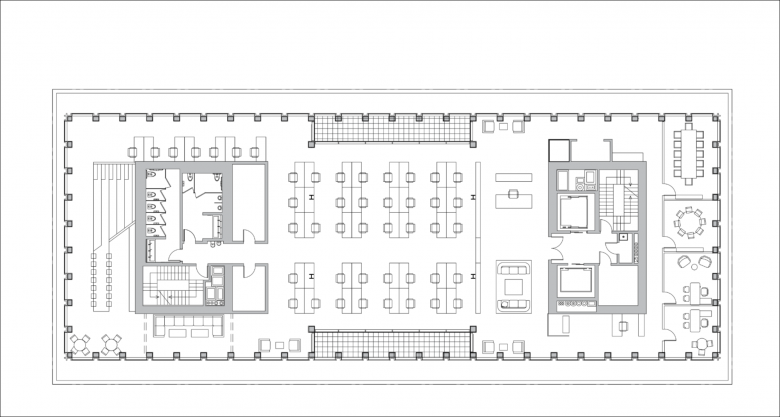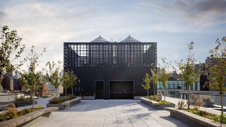 The exterior of the original building was preserved exactly as found, exhibiting patches of discolored brick. Inside, the generous ceiling heights of the original building remain, as do original concrete, brick, and timber elements that imbue the open concept office space with warmth and historic resonance. These same materials reappear in the new lobby, alongside board-formed concrete walls. The lobby also features a custom reception desk built using repurposed railroad ties that recall the nearby High Line.
