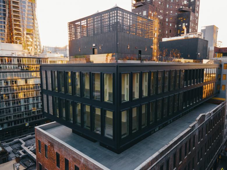 520 West 20th Street, also known as "The Warehouse," is a core & shell commercial office building within New York City’s Chelsea Art District. Located just off the High Line, the new 85,000-square-foot building is comprised of an existing four-story brick warehouse and a cantilevered glass and steel overbuild that adds three stories appearing to float above the existing structure.