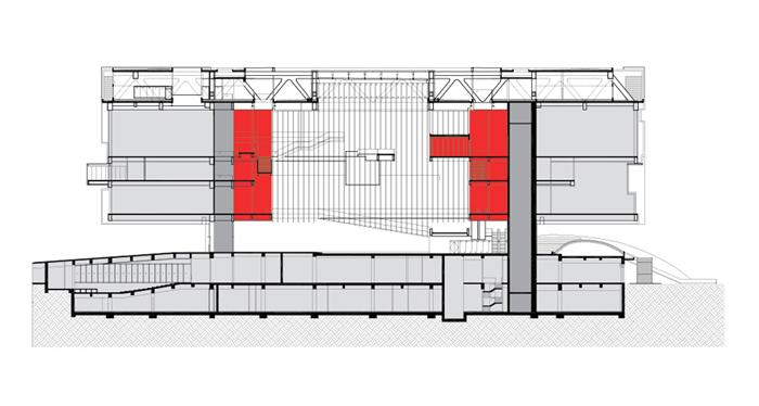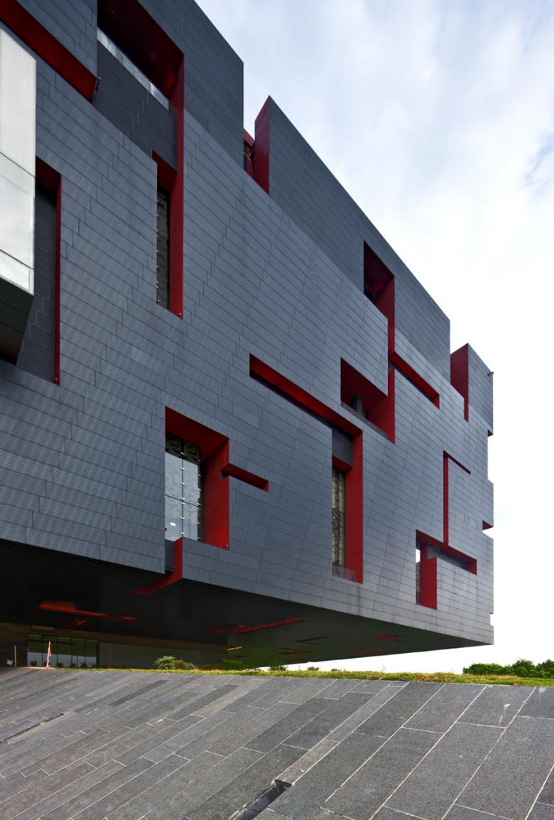 The design refers to the antique Chinese lacquer box used to keep valuable treasures, which perfectly reflects the purpose of the museum. The access from the main axis of the public space between the opera and the museum leads the visitor into the open foyer under the floating box. The exterior façade of the box with its geometric cuts for the openings looks the same on all four sides. The greyish aluminium cladding panels contrast with the red window reveals that define the irregular openings. The openness of the main interior hall, which is naturally lit from above, contrasts with its massive appearance from outside.