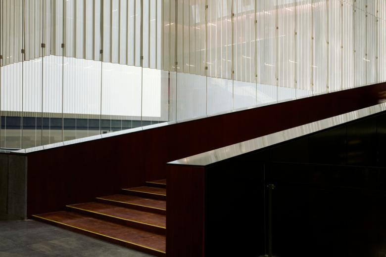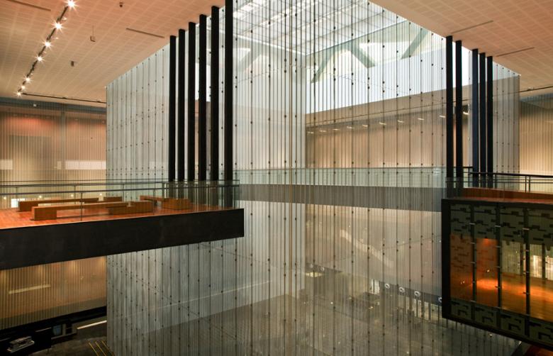 The circulation between floors along a path in the open atrium gives visitors the feeling of moving through an artificial landscape. With varying degrees of transparency and changing spatial arrangements, the visitor is animated to move from one exhibition hall to the next. The physical and visual connections across the atrium further motivate the movement. Besides the exhibitions, the building itself contributes a cultural treasure to the identity of contemporary culture in fast developing Guangzhou. In the direct vicinity of the spectacular organic forms of Zaha Hadid’s Opera House, the massive dark floating box provides a radical contrast, and builds a triangle with the Canton Tower across the river.