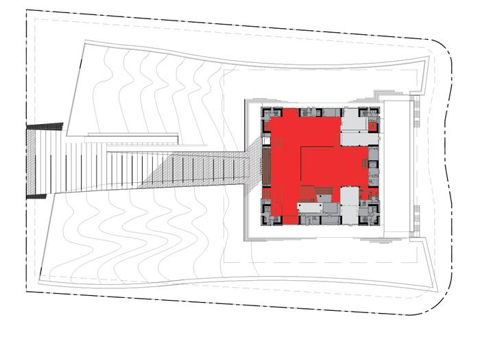 In 2004 Rocco Design Architects won the museum commission in an international competition of invited architects. The building is sited opposite the new Opera House, next to the green belt of the Pearl River. Floating above an artificial landscape that covers the podium of the museum and extends the undulating green space of the park, the main exhibition space is located in a square box, lifted above ground.