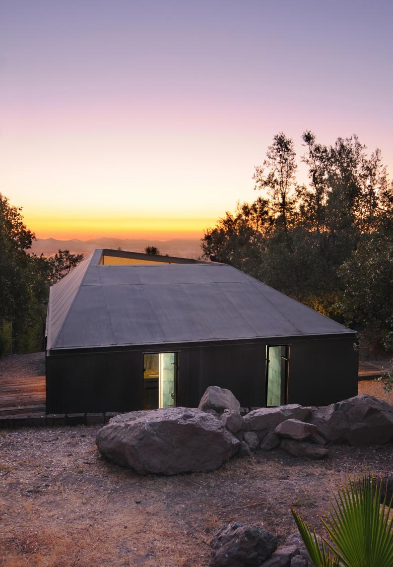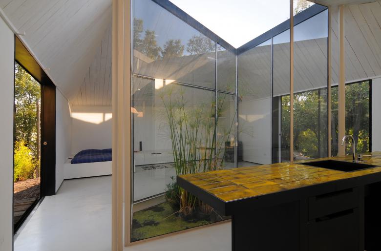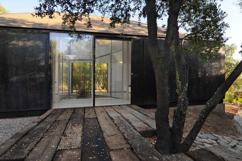 The exterior uses a mix of dark colors, creating streaks and textures that blend it into the surroundings. The box, dark on the outside, is therefore transformed into a white space that links the interior and exterior with the plants on the light-filled patio.