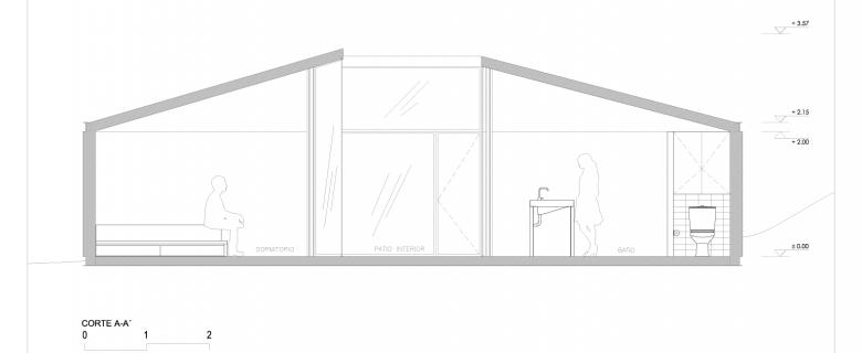 This 58 square-meter residential project in Santa Sofía has a bedroom, bathroom and kitchenette. This left the pre-existing house as a communal space with a kitchen, study, visitor’s bathroom and living room. The original house was exposed to the outside in order to link the interior with its landscape. The new project needed to be a more private and independent space, in keeping with the pre-existing construction.