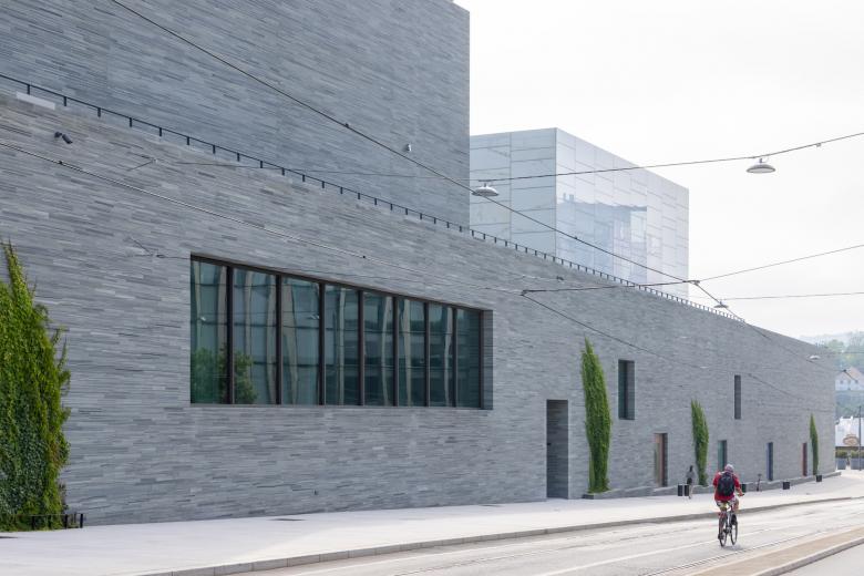 This fifth jewel in Oslo’s urban crown is the work of architect Klaus Schuwerk, who lives in Naples. He designed a place for art whose simplicity and seriousness are both a curse and a blessing. Schuwerk's design was awarded first prize out of 238 submissions in the competition held in 2010. His suggestion was to design a large art box on the site of Oslo West, the former railway station; for Norwegians from the hinterland and the coasts the terminus of the Vestbanen was the gateway to the capital and thus to Europe. Schuwerk designed the exterior with a gray slate facade that looks just as serious and dry as it is elegant and timeless. The different slender stone formats, which also characterize the interior facades of the circulation spaces, are reminiscent of the thermal baths in Vals, Switzerland, designed by Peter Zumthor.