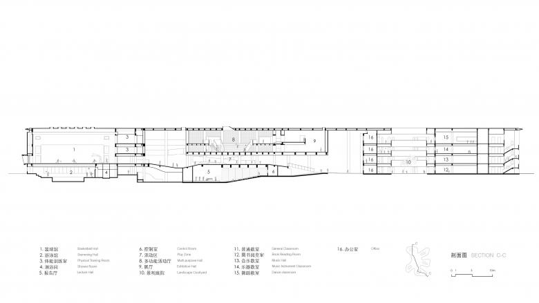 The Jiangdong New District was planned as a large organic grid along the coast that is already partly realised with standard box-shaped apartment blocks. In addition to these new developments, the campus is surrounded by some old village structures as well as a marshy, coastal landscape. The architects divided the almost rectangular site into four functionally different parts: the largest is for the high school building, plus another unit with residential buildings for the teachers and for students, a separate kindergarten and an open sports field.