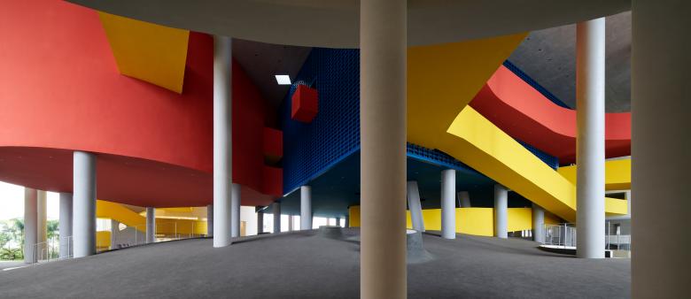 The extremely rich overall spatial compositions, which are designed with a differentiated colour concept depending on their use, allow students to easily find their way around. The roofing combines the heterogeneous ensemble of the school into a clearly readable group of buildings and creates shaded open spaces that significantly improve the quality of outdoor comfort in the tropical climate. Each of the three building groups has its own identity in the shared design canon, which sets this educational institution in sharp contrast to the surrounding residential quarters. The recognisable figure built for the children can also serve as a positive reference for the adults. In the end, however experimental teaching comes to be organised here, the structural prerequisites have certainly been put in place for it.