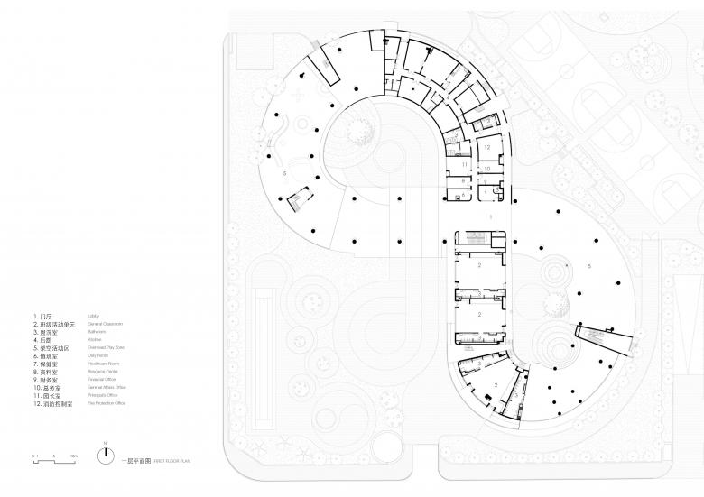 The separate kindergarten structure is designed in plan on the number eight, which stands for luck in Chinese symbolism. Even if the architects do not put this fact in the foreground of their architectural conception, it is still read that way by the population. This symbolism is so significant that the 2008 Olympic Games opened at 8.08 pm on 8 August, and a lot of money is paid for telephone numbers with the number eight.
