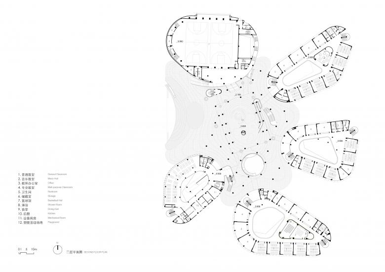 The largest group of structures is the four-storey high school, which is reminiscent of a starfish in its free form of five structures united under one roof. Each of the structures has an individual organic form. The basement of the largest structure houses a swimming hall, and above it is the basketball court with adjoining rooms. The classrooms are located in three pavilion-like structures, and the fifth structure houses an additional mixed-uses including the canteen on the ground floor and first floor, and the administration on the two floors above. At the core of each structure is an internal communication courtyard that is overlooked on the upper levels.