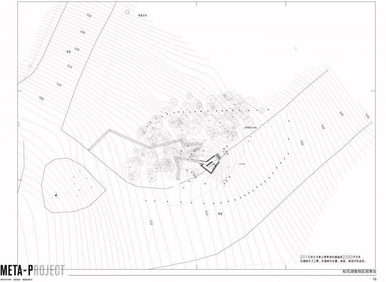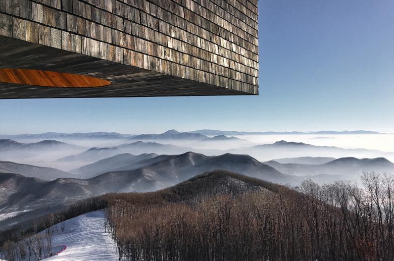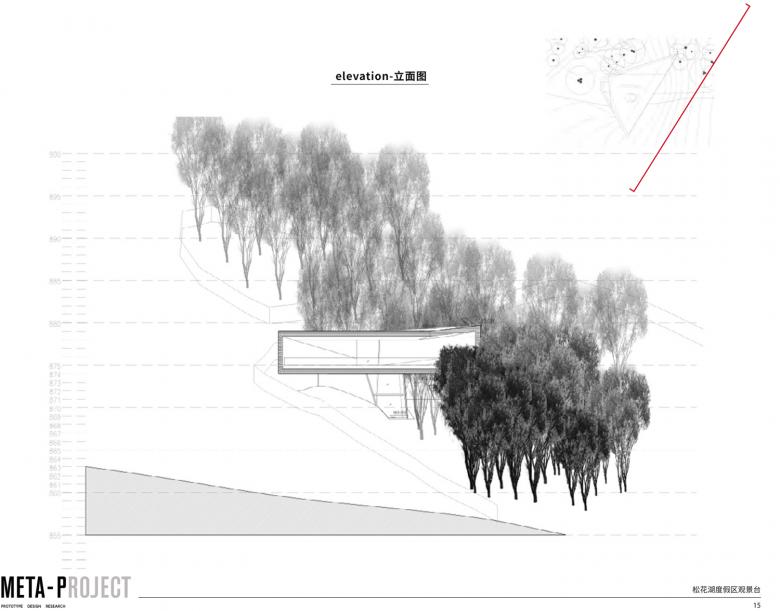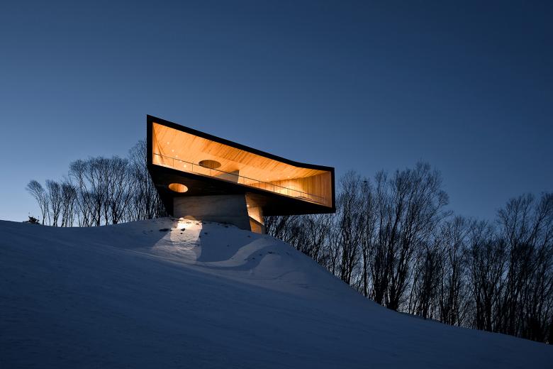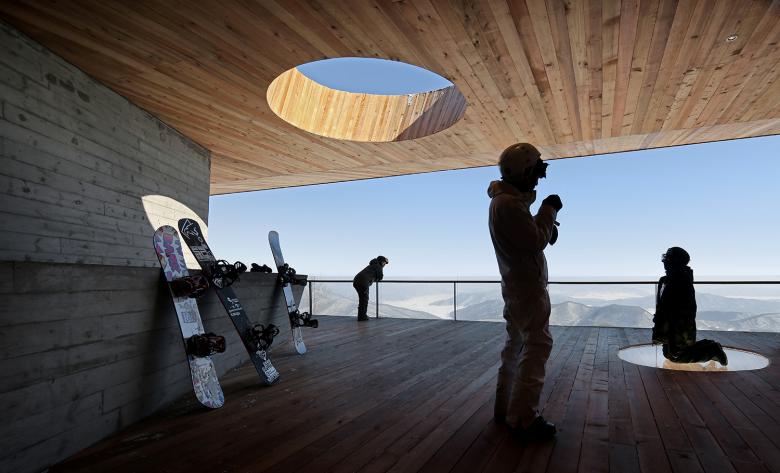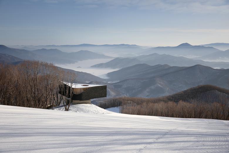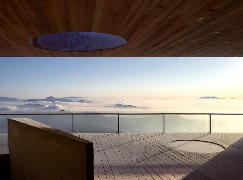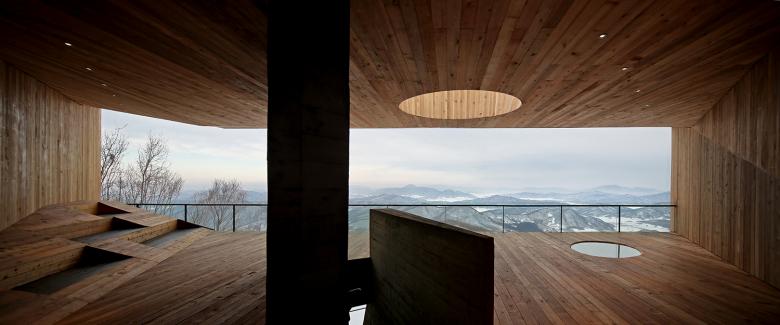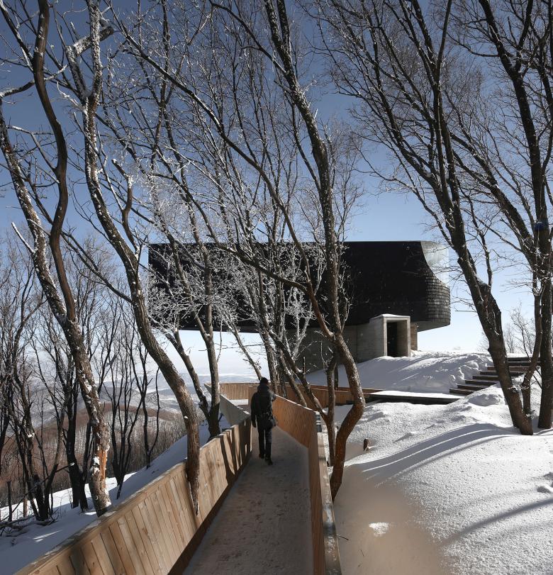 Meta-Project was commissioned to design a viewing platform that draws attention to the surrounding landscape. The folly platform stands at the edge of the forest next to the ski slope and uses the natural topographical situation to capture a panoramic view towards the mountain range and the Songhua Lake between its peaks. The site is surrounded by lush greenery in the summer, which is covered by snow in winter months.