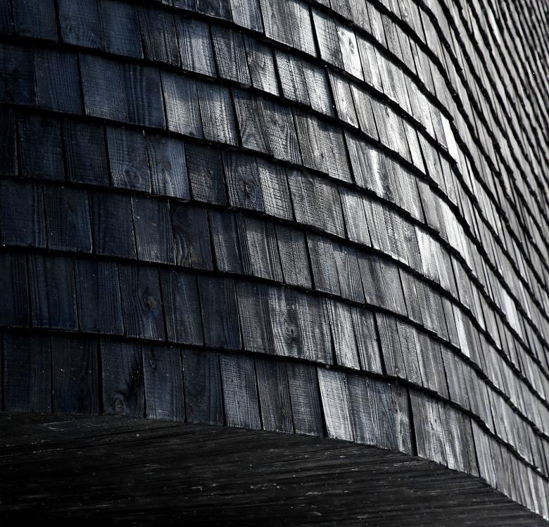 The architectural expression of the platform combines rough materiality with a sensuous form. Seen from afar, the 'stage' reads as a dark, free-floating monolith in the landscape, anchored by a heavy concrete base. As you come closer, the charred cedar shingles (Shou-Sugi-Ban) become perceptible, as they reflect the sunlight with a silver shine. Details, such as the textured wood patterning on the cast concrete and the rough surface of the shingles, only become visible once in front of the building.