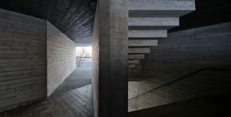 The interior is organized as a carefully choreographed experience. Upon entering the concrete vestibule, the eyes of the visitors must adjust to dimmed lighting. A narrow staircase guides the way up to the platform. On arrival at the top level a great panoramic view opens to Songhua Lake between the hills. The spatial experience thus opens up from the narrow and dark entrance to an exceptional vista across the landscape. The red cedar wood cladding on the interior of the viewing platform has been left untreated and displays its vivid colouring in the sunlight.