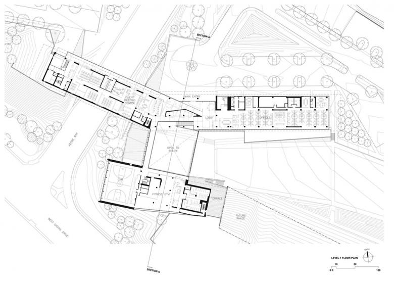 When we brainstormed ideas with our clients, some of the words they gave us were “innovative,” “athletic,” “eye-catching,” and “bold.” They wanted the building to be a sign to the world that Adobe is about the future. This conversation inspired the cantilevered forms of the buildings, which reach out to the freeway and to the mountains. The cantilevers also allow the buildings to navigate the challenging site, with a 60-foot level change from one end to the other, without the need for extensive grading, which would have added significantly to construction costs. To reinforce Adobe’s commitment to attracting and retaining top talent, we made the campus highly visible to passersby, with extensive glazing to expose the program elements within. We placed the most active areas at the perimeter, so people driving by can see the activity inside—people meeting in conference rooms, crossing the bridge that spans the road, eating in the café, working out in the fitness center, shooting hoops on the basketball court.