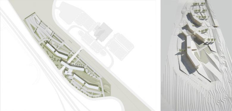 Adobe chose a 38-acre site in Lehi, which lies between Salt Lake City and Provo. Long and narrow, the site flanks Interstate 15 and is bifurcated by a four-lane public road. It also offers expansive vistas to Utah Valley, the picturesque Lake Utah, and the striking Wasatch and Oquirrh mountain ranges. In the master plan and architecture, we interpreted the Interstate as a natural phenomenon, on the scale of mountains and rivers, to be celebrated for its energy.