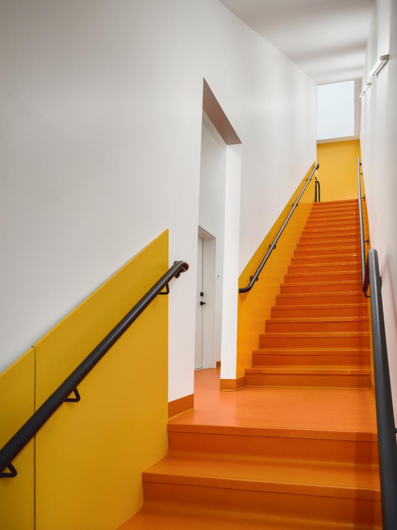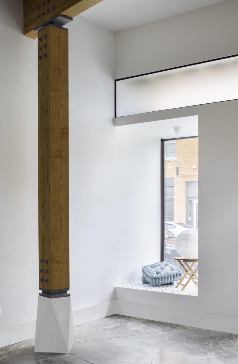 The use of exposed glulam columns and beams in the retail area, and a simple palette consisting of concrete, wood, white walls and tiles, and distinctive rubber floors in common areas.